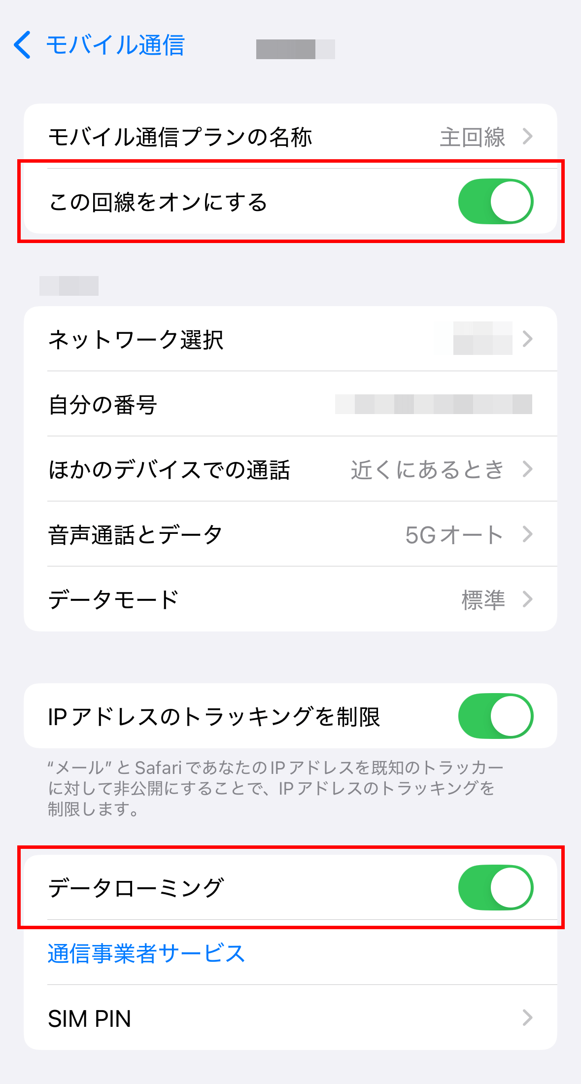 設定>モバイル通信>eSIMの回線(主回線以外)をタップ>この回線を「オン」にしていただきます。