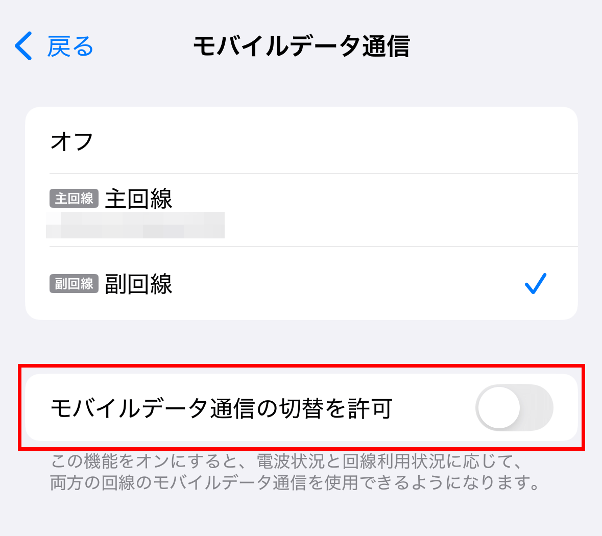 設定>モバイル通信>eSIMの回線(主回線以外)をタップ>この回線を「オン」にしていただきます。