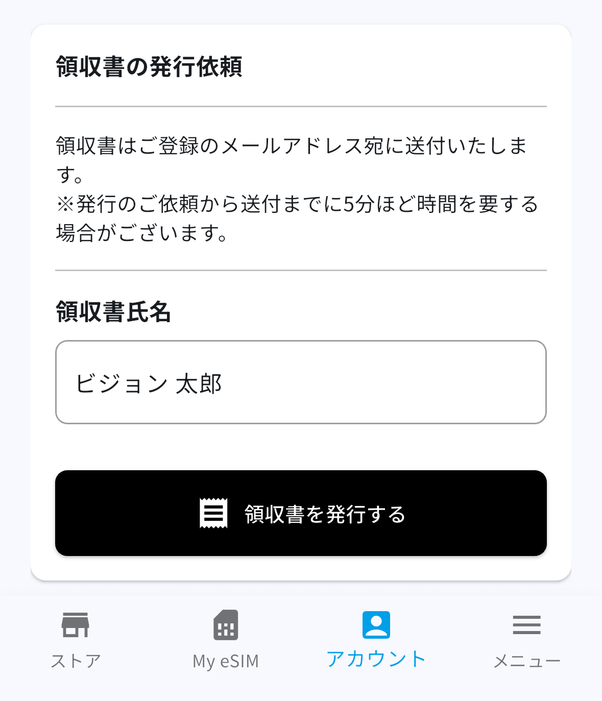 アプリ、もしくはWEBサイトの「アカウント」→「ご注文履歴」→「ご注文詳細」より領収書発行をご依頼いただけます。